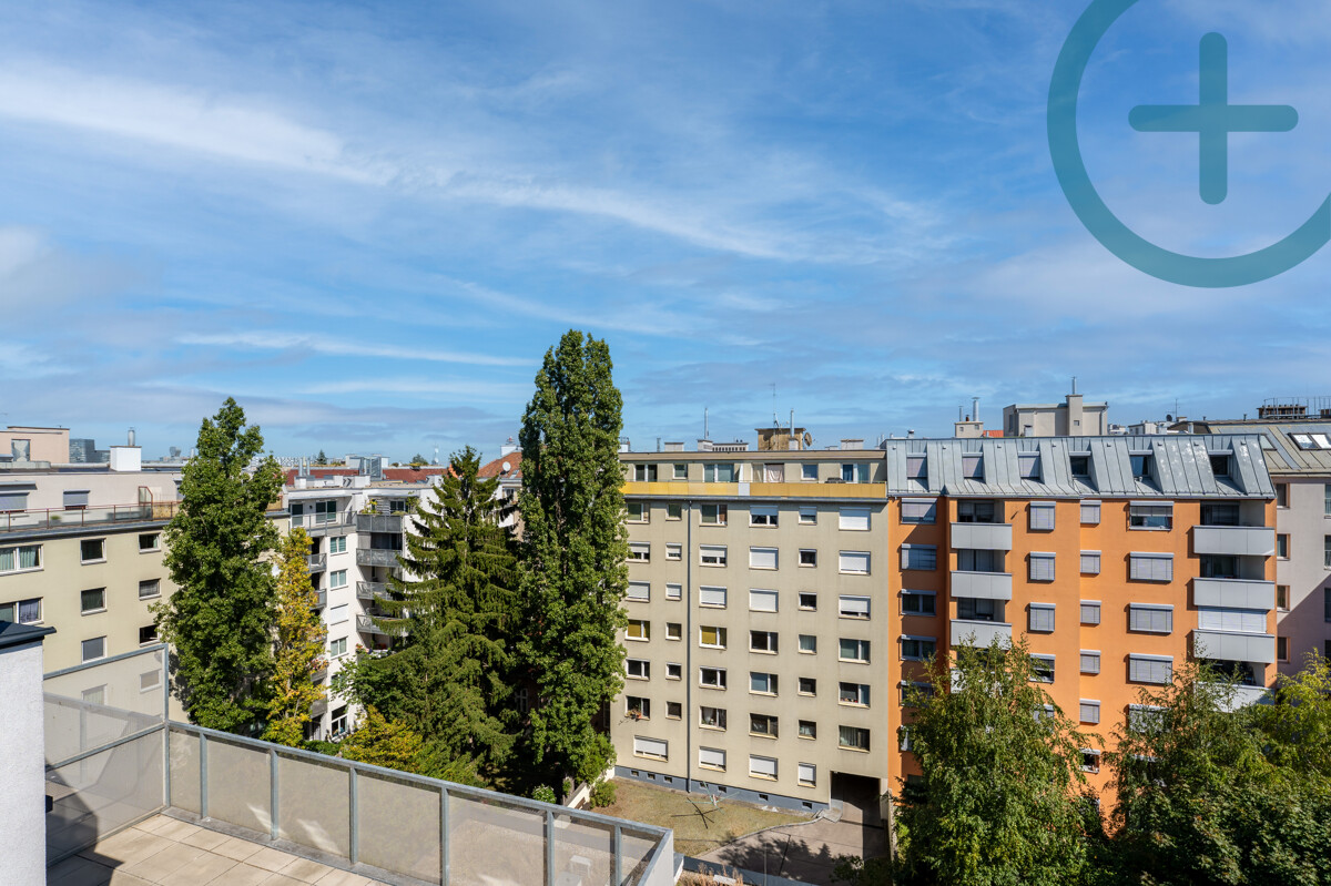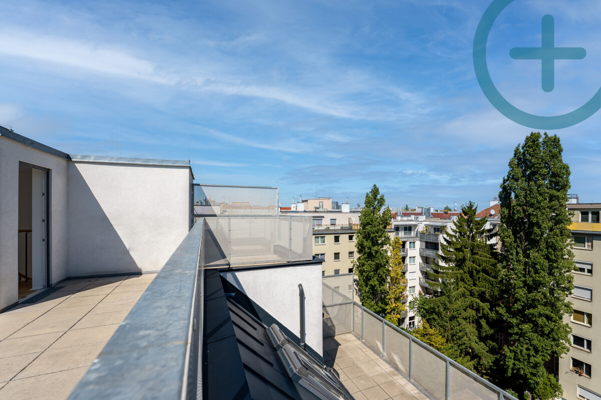 Ein besonderes Highlight ist die private Dachterrasse mit rund 43 m², die direkt über eine Treppe vom Wohnbereich erreichbar ist. Sie bietet viel Platz für gesellige Abende und sonnige Rückzugsmomente über den Dächern der Stadt.